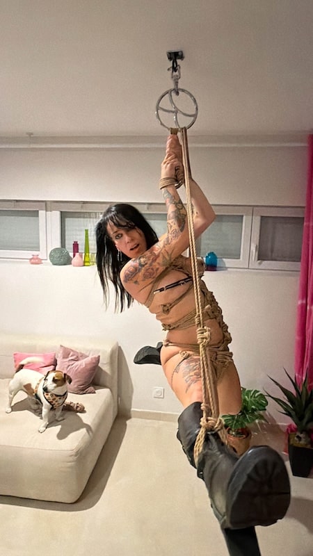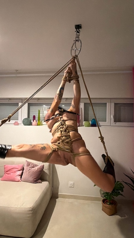 J’adore sentir les cordes sur la peau, cette sensation d’être serrée, immobilisée. C’est infiniment sensuel. Elle me propose une suspension, comme autrefois, une suspension libre, les mains attachées au-dessus de la tête, les chevilles séparément reliées à de longues cordes, libres de bouger. Je peux jouer avec les cordes, tourner, faire le grand écart. C’est génial, j’adore ça, mais ce n’est pas de tout repos et c’est très physique. Les cordes autour des poignets et les chevilles commencent vite à serrer. Je ne tiens pas longtemps, mais suffisamment pour quelques jolies photos et pour constater que je sais encore jouer dans cette position. Quel plaisir !